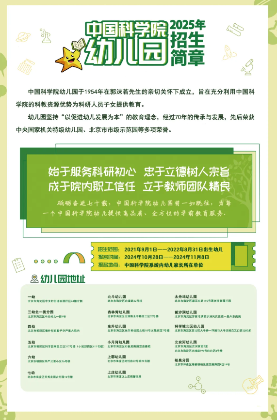 2025年北京各城区幼儿园入园摸底信息持续更新!中国科学院幼儿园2025年入园预报名招生通知即将启动,本文为您分享详情。