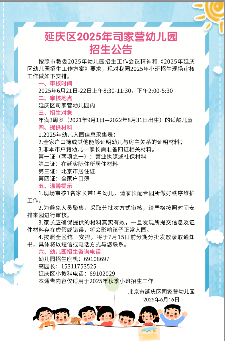 2025年延庆区幼儿园招生简章持续更新,其中延庆区司家营幼儿园发布2025年招生简章,延庆区司家营幼儿园2025年招生简章针对的哪个年龄范围的幼儿园?2025年延庆区幼儿园入园信息采集时间范围是什么?延庆区司家营幼儿园入园招生报名方式是什么?京籍、非京籍报名延庆区司家营幼儿园需要满足哪些材料要求及条件?北京幼升小网为您分享同步2025年幼儿园招生简章相关信息,建议延庆区家长及时查看参加。