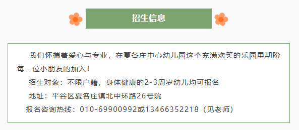 我们怀揣着爱心与专业,在夏各庄中心幼儿园这个充满欢笑的乐园里期盼每一位小朋友的加入!