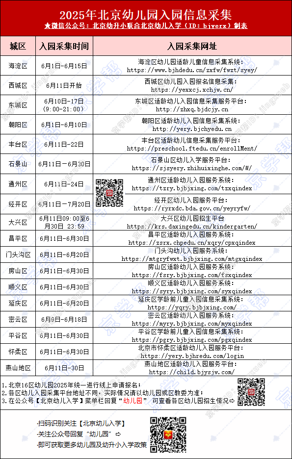 依照目前信息来看,北京各城区均需要参加统一进行网上信息采集,家长可以通过信息采集入口在规定时间内进行报名,2026年北京幼儿园入园家长可参考2025年的入园信息采集时间: