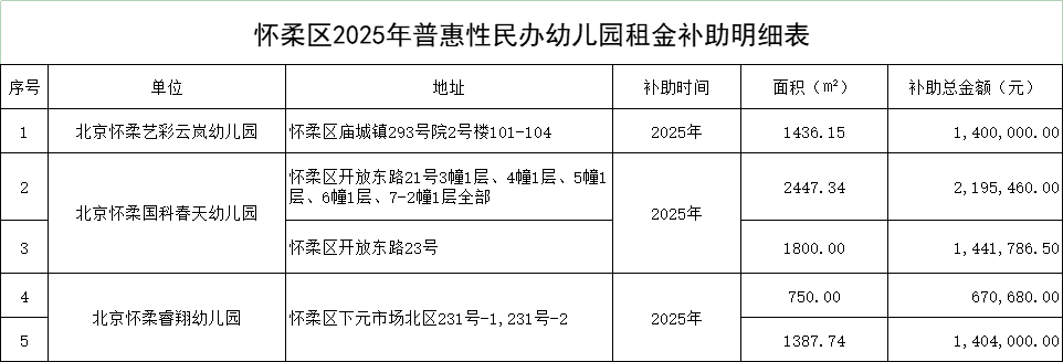 根据《北京市市级财政支持学前教育发展补助资金管理使用实施细则》(京财教育〔2023〕1782号)文件精神,现将怀柔区2025年普惠性民办幼儿园租金补助进行公示,具体情况见附件。