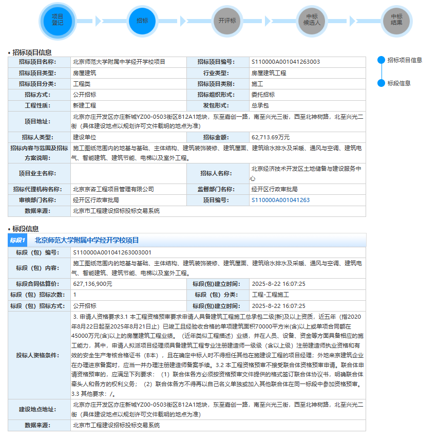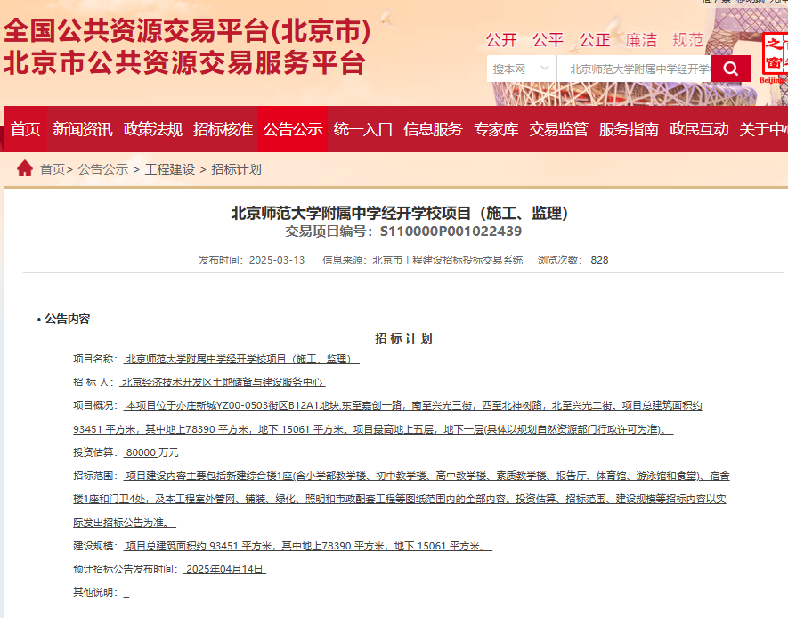“北京师范大学附属中学经开学校项目(施工、监理)”公示信息