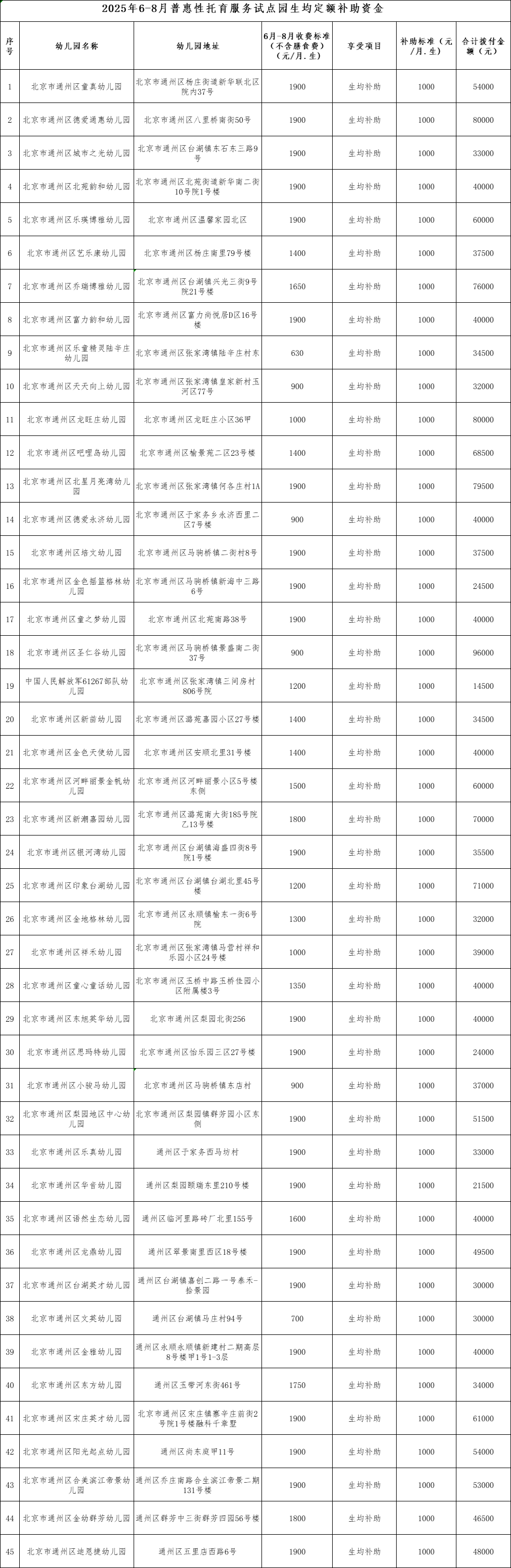 通州区关于2025年6-8月普惠性托育服务试点园生均定额补助资金的公示