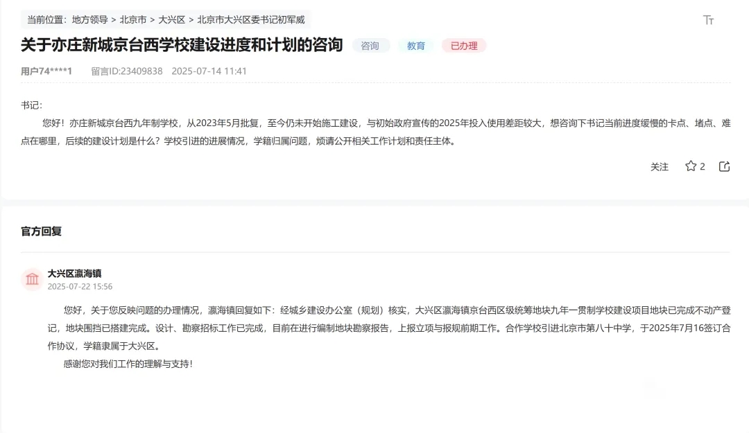经城乡建设办公室(规划)核实,大兴区瀛海镇京台西区级统筹地块九年一贯制学校建设项目地块已完成不动产登记,地块围挡已搭建完成。设计、勘察招标工作已完成,目前在进行编制地块勘察报告,上报立项与报规前期工作。合作学校引进北京市第八十中学,于2025年7月16签订合作协议,学籍隶属于大兴区。