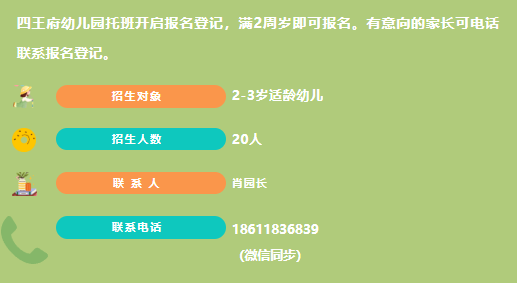 四王府幼儿园托班开启报名登记,满2周岁即可报名。有意向的家长可电话联系报名登记。