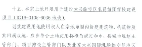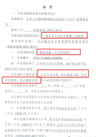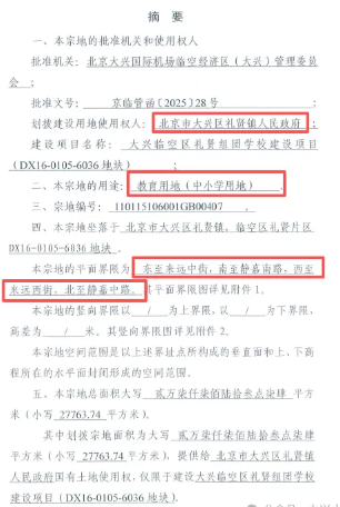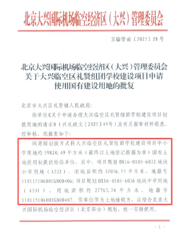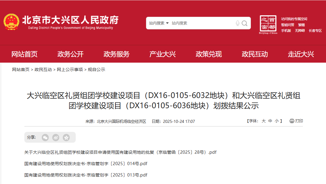大兴区人民政府官网发布了关于“大兴临空区礼贤组团学校建设项目(DX16-0105-6032地块)和大兴临空区礼贤组团学校建设项目(DX16-0105-6036地块)划拨结果公示”。