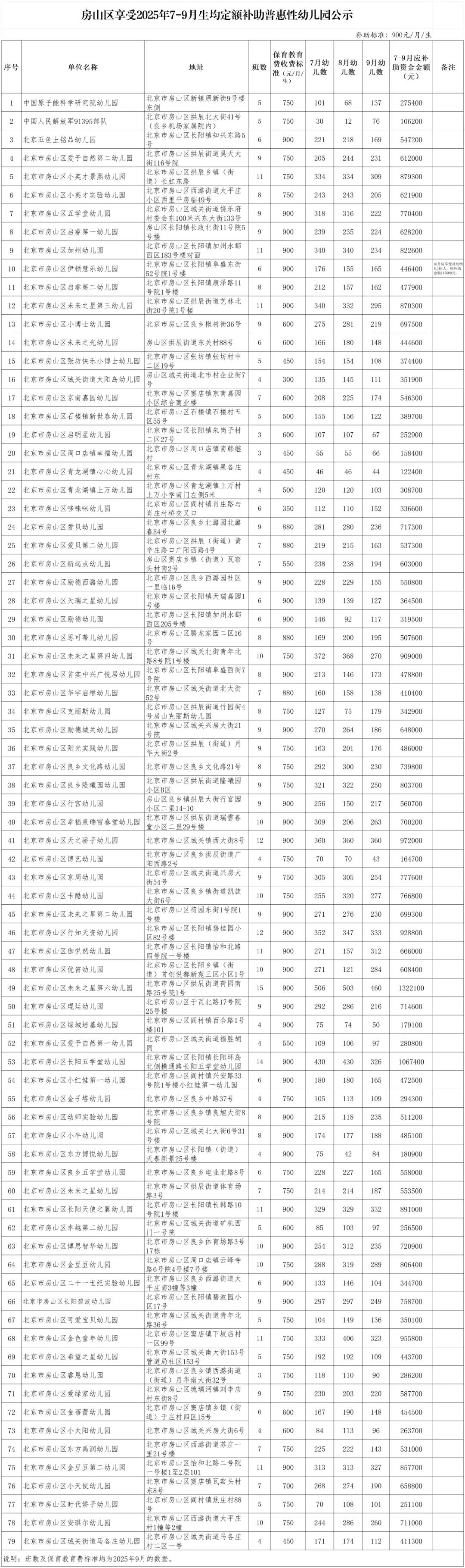 房山区教委关于享受2025年7-9月生均定额补助普惠性幼儿园的公示