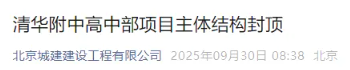 良乡大学城清华附中高中部近日完成主体结构封顶。项目位于房山区良乡大学城拓展东区,总投资约4.5亿元,建设规模约6.4万平方米,建设内容包括教育用房等,新建48班高中,新增学位2160个,目前已完成主体结构封顶。
