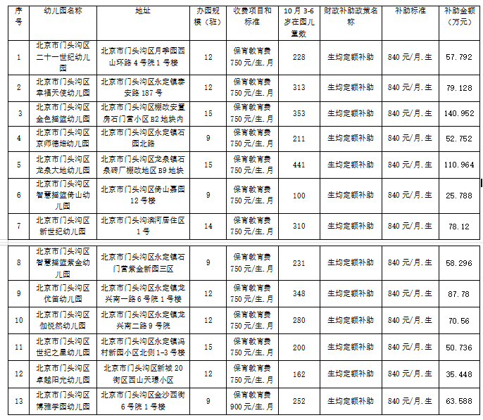 依据《北京市市级财政支持学前教育发展补助资金管理使用实施细则》(京财教育〔2023〕1782号)《门头沟区市级财政支持学前教育发展补助资金管理使用实施细则》(门财文〔2024〕48号)的文件要求,拟对北京市门头沟区13所民办普惠园2025年10-12月份生均定额补助资金情况(见附件)予以公示,公示期为2025年10月16至10月22日,公示期间如有异议,可以通过电话、信函、来访等方式实名向区教委办公室反映。