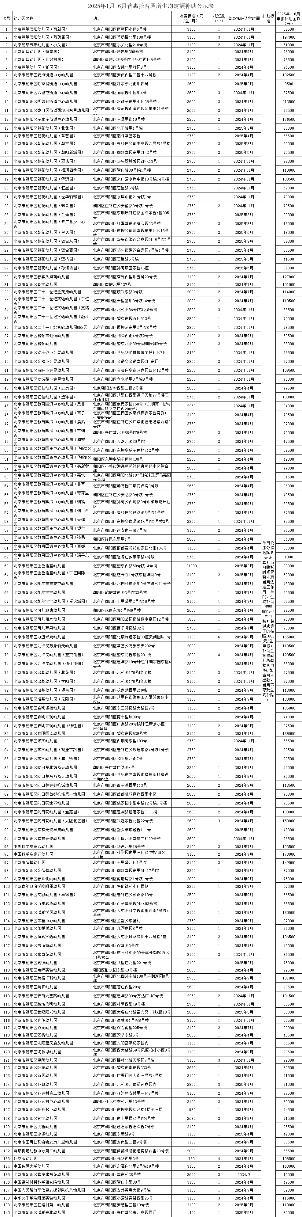 根据《北京市财政局北京市卫生健康委员会北京市教育委员会关于印发<北京市普惠托育服务试点工作财政补助资金管理办法>》(京财社[2023]2219号)及《北京市朝阳区普惠托育服务试点工作财政补助资金实施细则》(朝财社[2024]215号)文件要求,现对朝阳区享受普惠托育园所2025年1-6月生均定额补助的情况予以公示。公示期为2025年11月11日至2025年11月17日。如有异议,可在公示期间向朝阳区教育委员会反映。