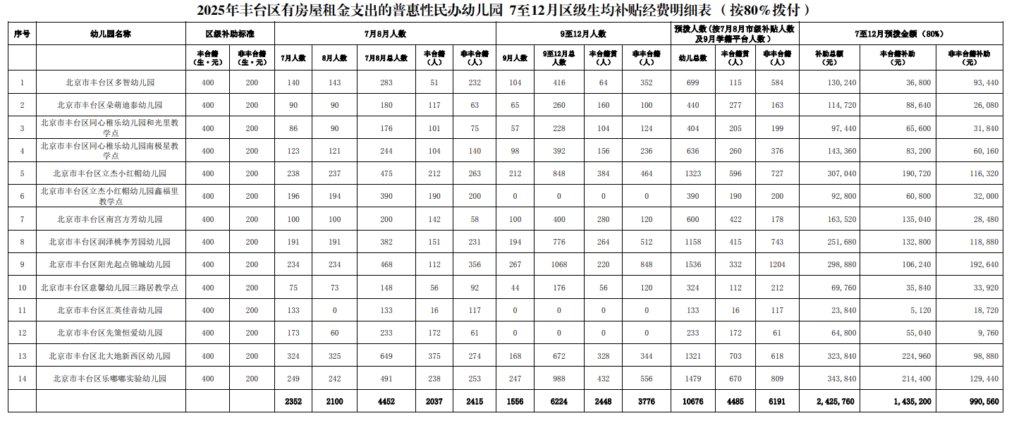 丰台区有房屋租金支出的普惠性民办幼儿园7至12月区级生均补贴经费的公示