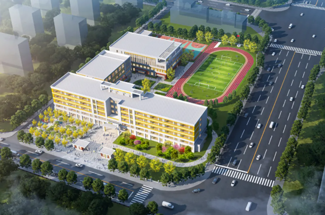 据了解,项目包含教学主楼、室外看台及体育用房等,同时还将建设风雨操场、学生阅览室及各类专用教学用房,满足师生教学、活动需求。项目在规划设计上匠心独运,突出教育功能,采用层层递进的院落半围合布局,构建出排列有序且丰富多样的综合性建筑群。