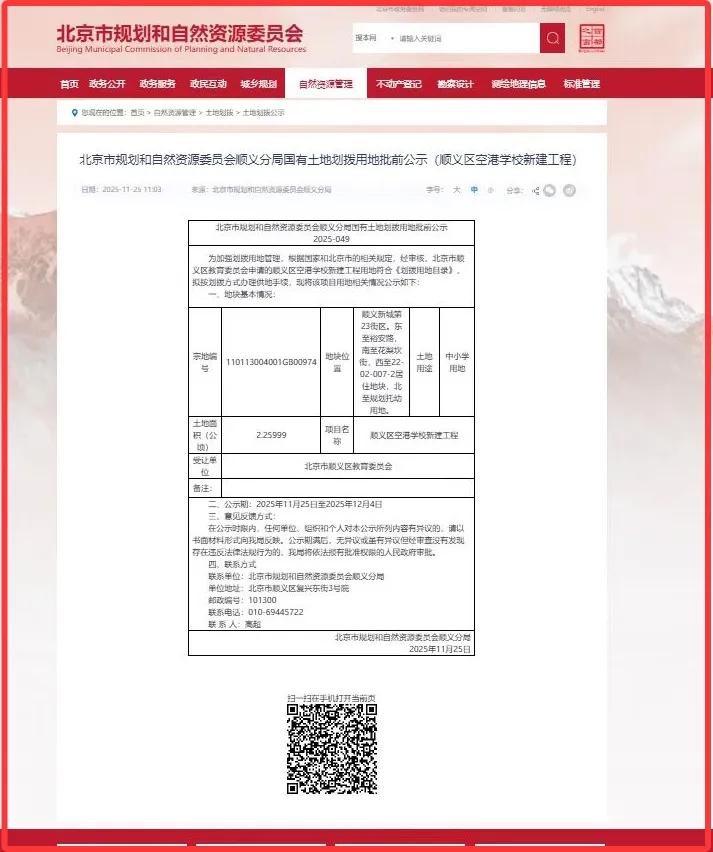 目前,空港学校新建工程用地划拨进入批前公示阶段,公示期为2025年11月25日至12月4日。公示期间,任何单位、组织或个人如有异议,可向北京市规划和自然资源委员会顺义分局以书面形式反映。如无异议或异议不成立,分局将依法报请有批准权限的人民政府办理后续审批手续。