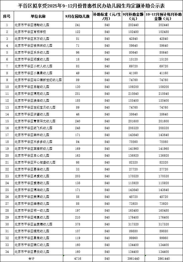 关于平谷区拟享受2025年9-12月生均定额补助普惠性民办幼儿园名单的公示