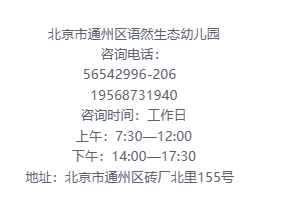 北京市通州区语然生态幼儿园,是一所普惠性幼儿园,位于通州区临河里路砖厂北里155号。占地面积7100平方米,建筑面积5680平方米,校园绿化面积充足,植物种类多,2018年12月正式开园,2019年通过北京市教育督导评估B级验收,现开设19个教学班,在册幼儿600多名,90多名教职员工。