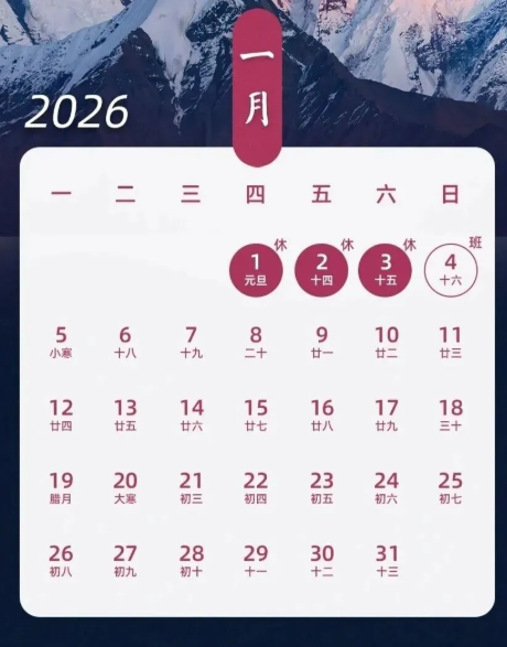 2026年1月1日(周四)至3日(周六)放假调休,共3天。