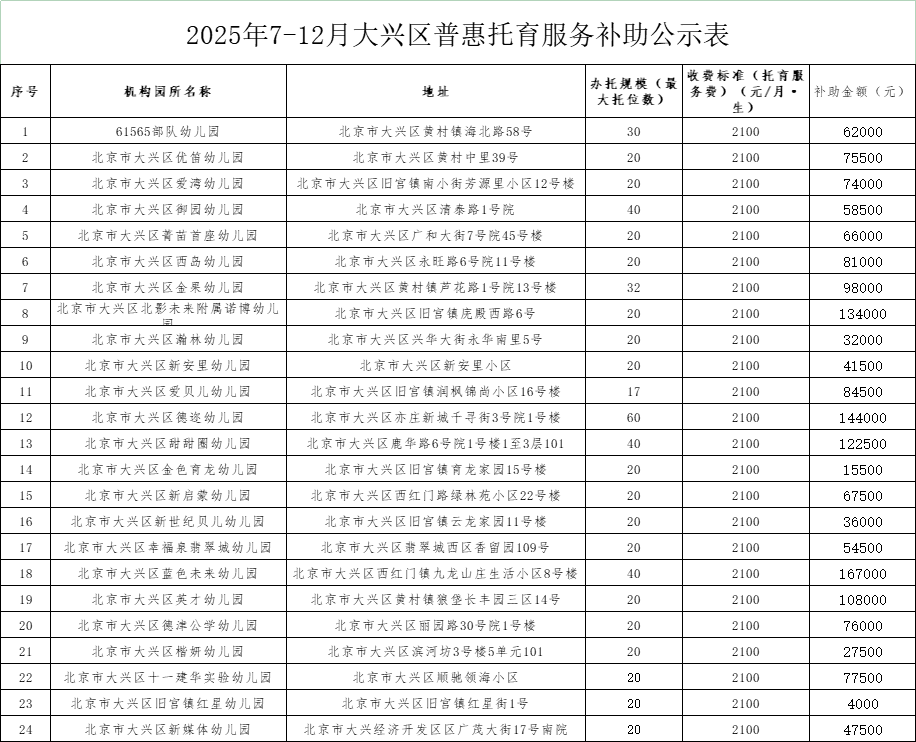 大兴区2025年7-12月普惠托班补助幼儿园名单公示