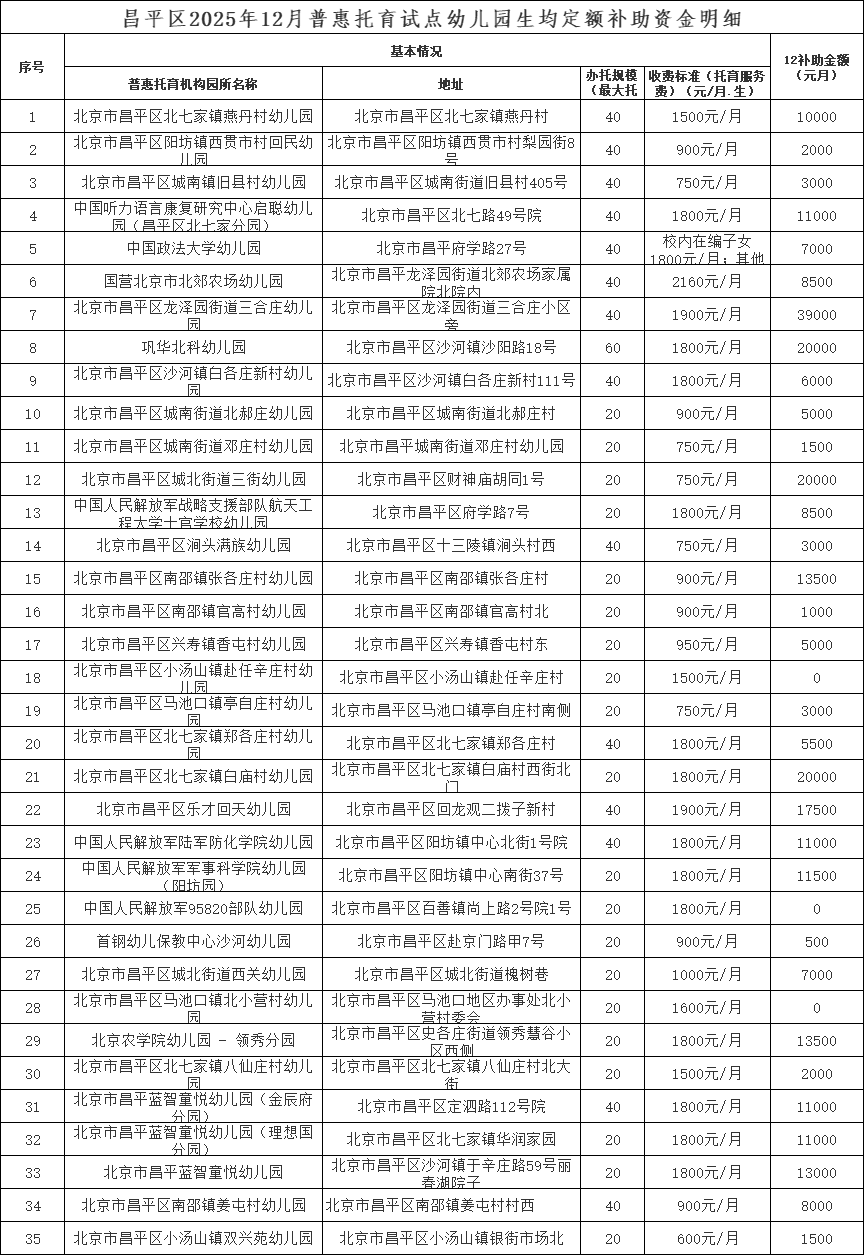 根据北京市财政局北京市卫生健康委员会 北京市教育委员会关于印发《北京市普惠托育服务试点工作财政补助资金管理办法》的通知(京财社〔2023〕2219号)、《北京市昌平区关于普惠托育服务试点认定及财政补助资金管理办法(试行)》(昌卫发〔2024〕4号)文件要求,普惠性幼儿园依程序自愿申报,区教委严格审核,确定了昌平区拟享受2025年12月托育生均定额补助资金的普惠性幼儿园名单,并依据文件规定,现将相关信息予以公示(详见附件)。