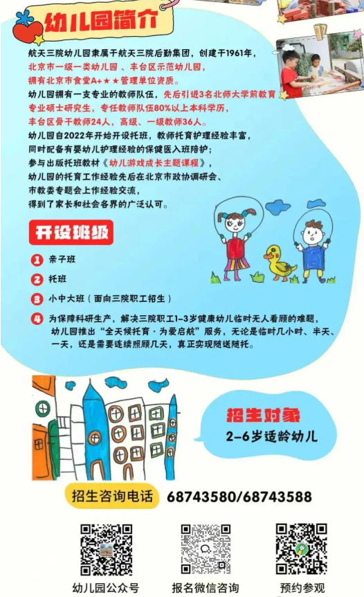 2026年北京16区幼儿园招生简章大汇总持续更新,其中丰台区航天三院幼儿园现正式发布2026年春季招生简章。作为具有航天特色的优质幼儿园,面向亲子班、托班、小中大班招生,本文为2026年丰台区入园家长分享报名招生详情。