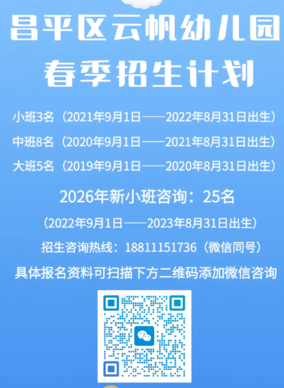 2026年北京16区幼儿园招生简章大汇总持续更新,其中昌平区云帆幼儿园2026年春季招生正式启动!园内设施完备,是一所全日制民办普惠性幼儿园,面向小班、中班、大班招生,详细报名信息请查看下文。