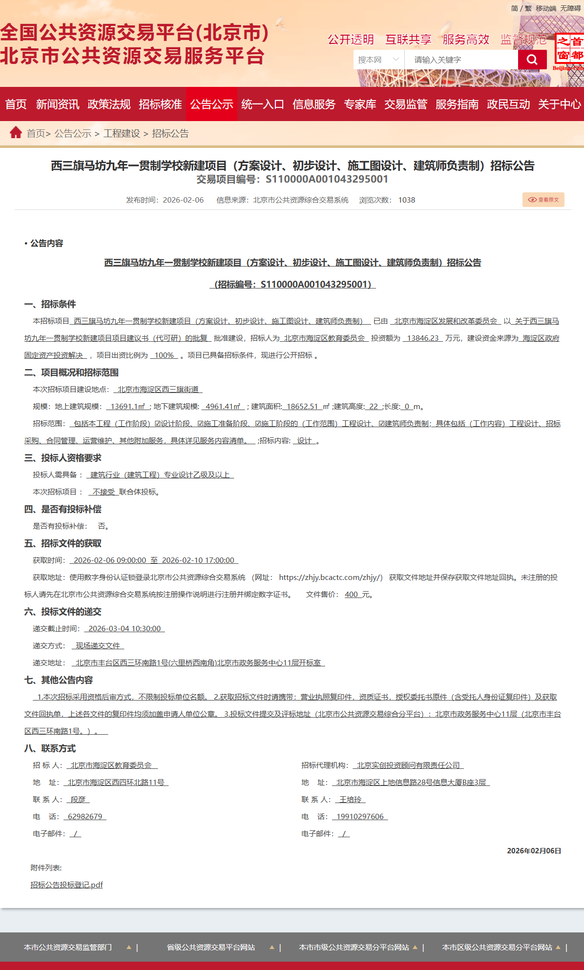 2月6日,西三旗马坊九年一贯制新学校新建项目(方案设计、初步设计、施工图设计建筑师负责制)招标公告: