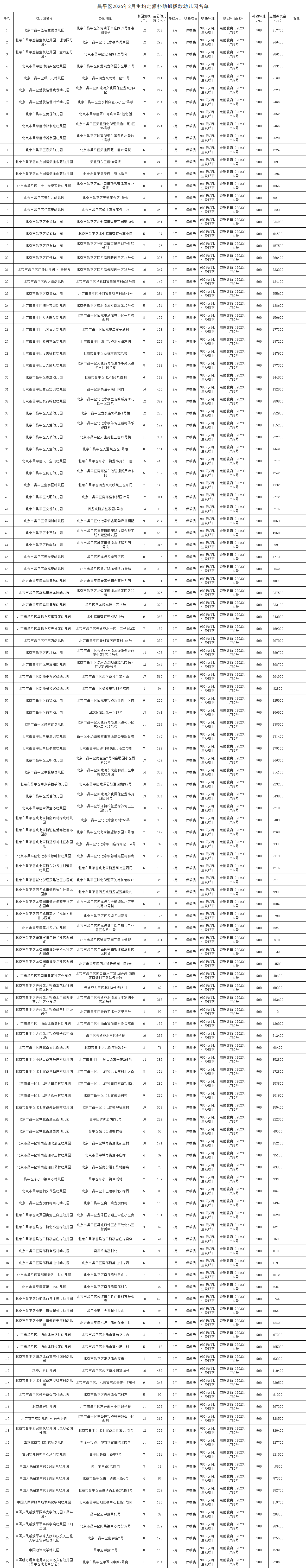 根据《北京市财政局 北京市教育委员会关于修订北京市市级财政支持学前教育发展补助资金管理使用实施细则的通知》(京财教育〔2023〕1782号)文件的相关要求,各幼儿园依程序自愿申报,区教委严格审核,确定了昌平区拟享受2026年2月财政支持学前教育发展补助资金(生均定额补助)幼儿园名单。依据文件规定,现将相关信息予以公示(详见附件)。
