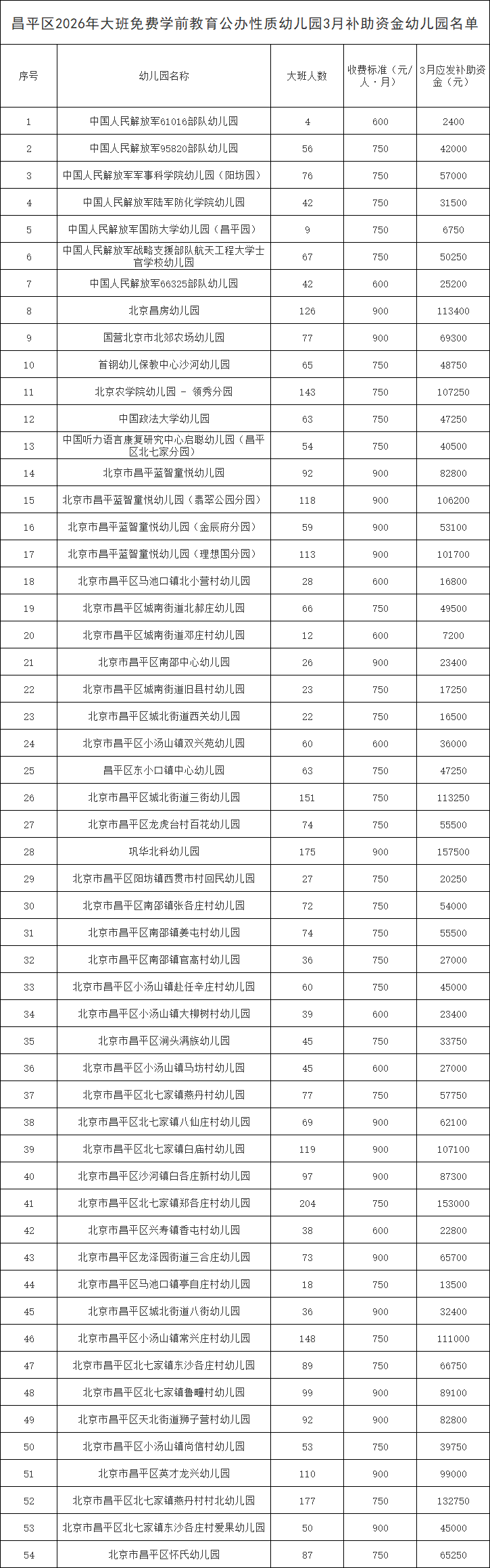 昌平区拟享受昌2026年大班免费学前教育公办性质幼儿园3月补助资金幼儿园名单公示