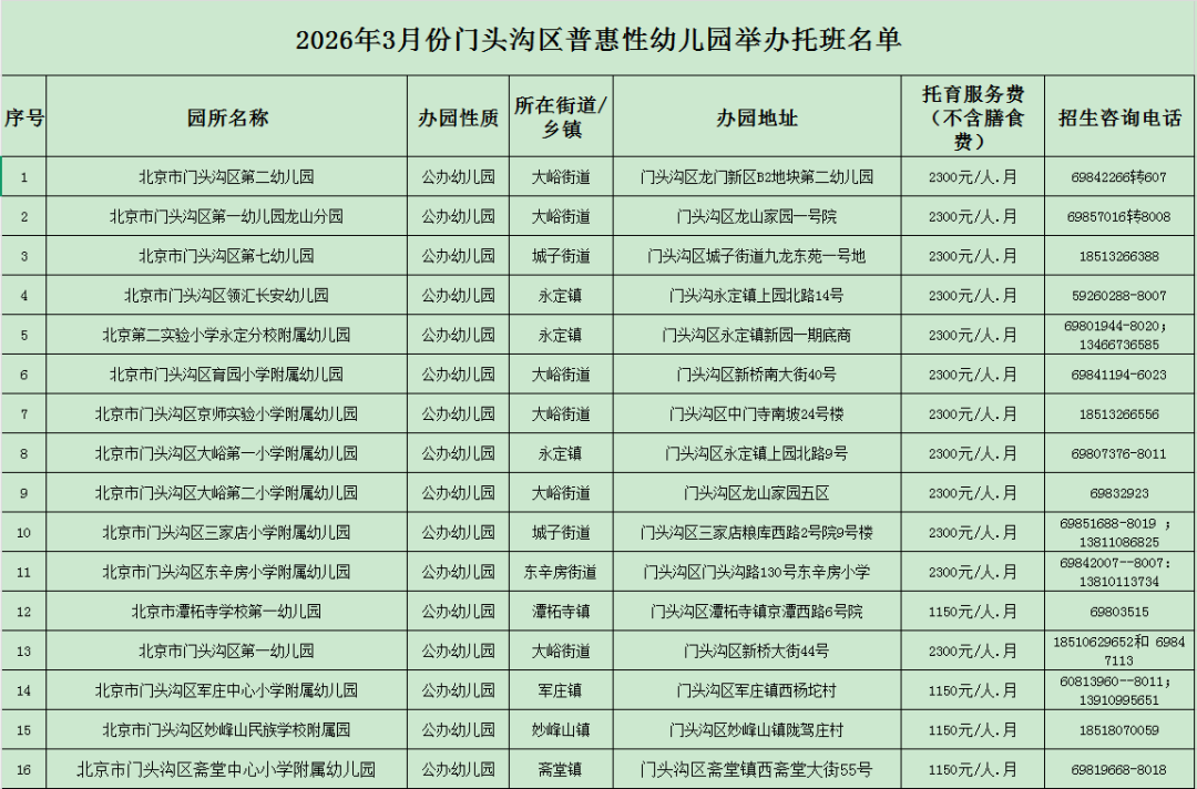 2026年3月份门头沟区普惠性幼儿园举办托班名单