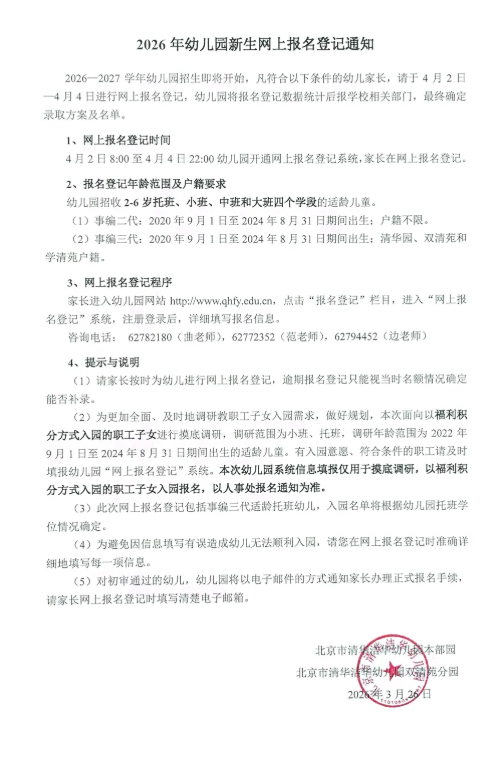 海淀区清华洁华幼儿园本园、双清苑分园2026年幼儿园新生网上报名登记通知
