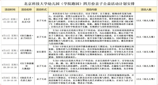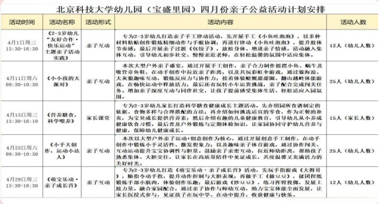 2026年北京各区幼儿园入园招生摸底、入园需求调查通知,其中海淀区北京科技大学幼儿园2026年4月继续面向社区婴幼儿家庭,开展亲子体验活动,本月共五次活动,四次亲子互动活动,本文分享宝盛里园、学院路园两个园址的活动计划安排、报名要求等信息,有意向的家长可关注本文要求按时报名。