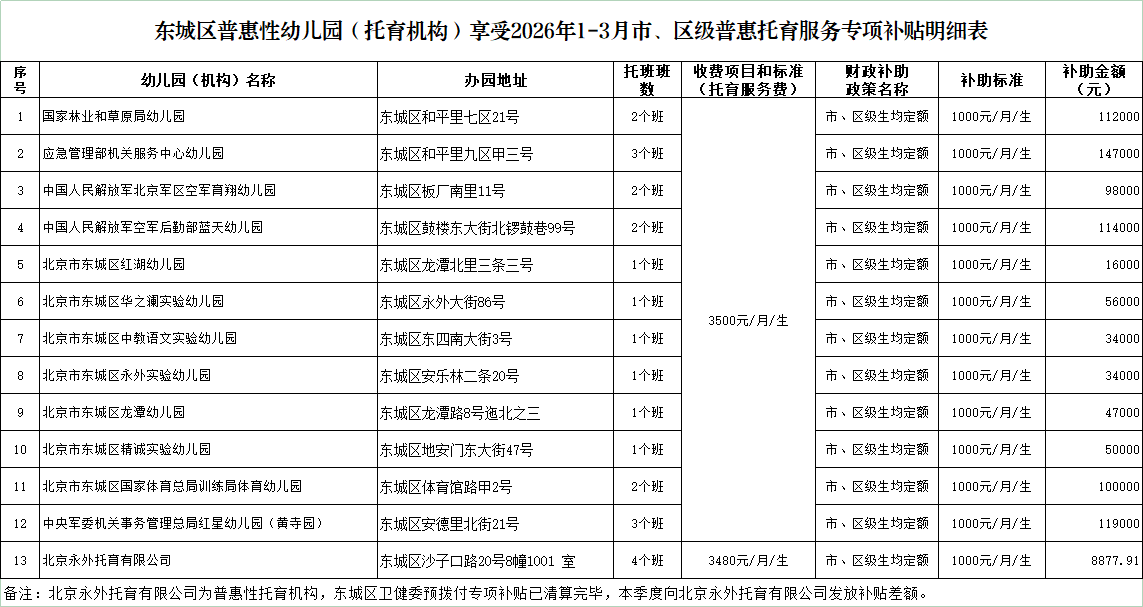 根据北京市人民政府办公厅《关于印发<北京市托育服务体系建设三年行动方案(2023年—2025年)>的通知》(京政办发〔2023〕6号),北京市卫生健康委员会、北京市教育委员会、北京市发展和改革委员会、北京市财政局《关于开展普惠托育服务试点工作的通知》(京卫家庭〔2023〕22号),北京市财政局、北京市卫生健康委员会、北京市教育委员会《北京市普惠托育服务试点工作财政补助资金管理办法》(京财社〔2023〕2219号)、《北京市东城区普惠托育服务试点工作财政补助资金管理实施细则》等文件要求,现将东城区普惠性幼儿园(托育机构)享受2026年1-3月市、区级普惠托育服务专项补贴公示如下,具体见附件。