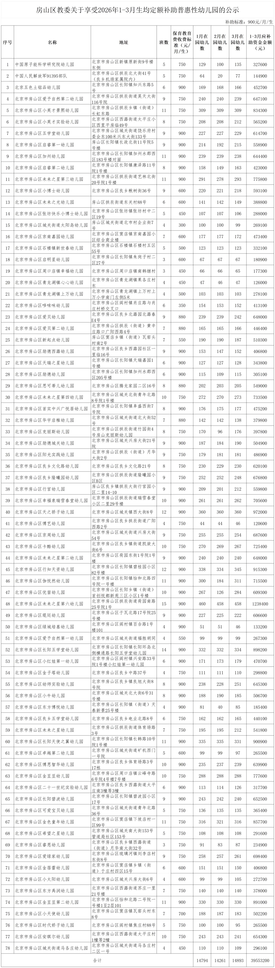 根据《北京市财政局 北京市教育委员会关于修订<北京市市级财政支持学前教育事业发展补助资金管理使用实施细则>的通知》(京财教育[2023]1782号)、《北京市房山区教育委员会 北京市房山区财政局关于印发<房山区关于市级财政支持学前教育事业发展补助资金管理使用的实施细则(试行)>的通知》(房教发[2024]30号)》文件要求,按照房山区普惠性幼儿园补助资金拨付工作安排,区教委已完成了对申请享受2026年1-3月生均定额补助的普惠性幼儿园材料的审核,现将审核情况予以公示。