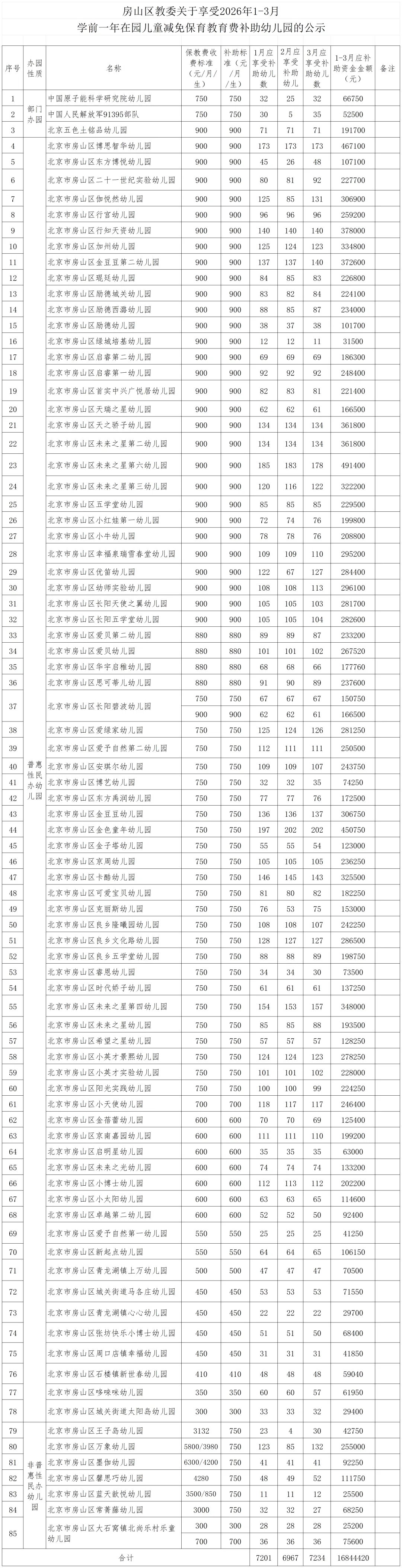 根据《北京市财政局 北京市教育委员会关于印发<北京市落实免费学前教育实施方案>的通知》(京财教育〔2025〕1486号)、《北京市房山区教育委员会 北京市房山区财政局关于印发<房山区落实免费学前教育实施细则>的通知》(房教发〔2025〕22号)》文件要求,区教委已完成对申请享受2026年1-3月学前一年在园儿童减免保育教育费补助的幼儿园材料的审核,现将审核情况予以公示。