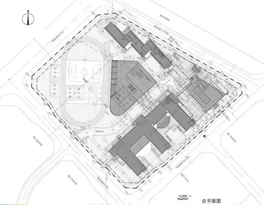 这所新学校被城市道路与水系环抱。我们来看一下学校的四至: