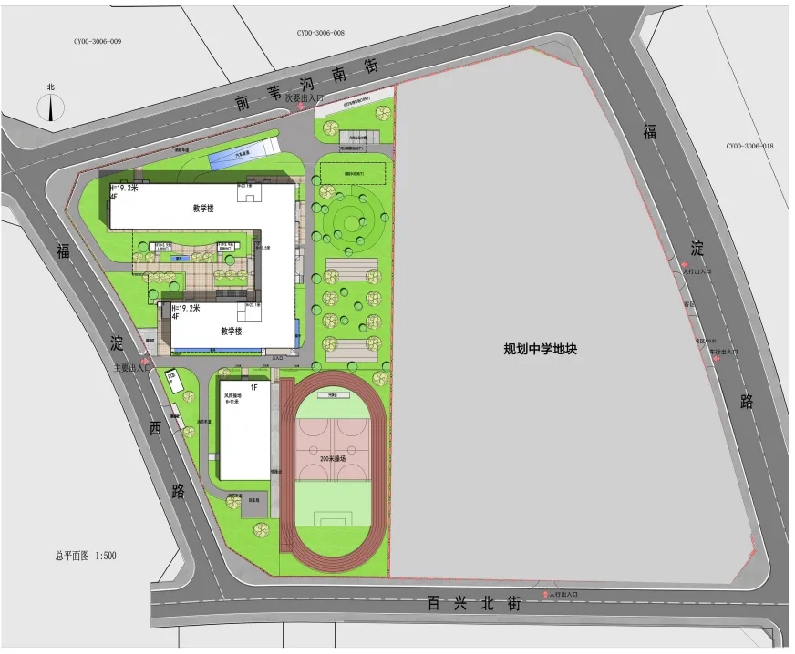 朝阳区孙河乡前苇沟组团 3006-017 地块规划中学建设工程项目位于北京市朝阳区孙河乡,项目四至为:北至前苇沟南街,东至福淀路,南至百兴北街,西至3006-012地块。建设单位为北京市朝阳区教育服务保障中心,现委托北京立人设计集团有限公司进行了规划方案设计: