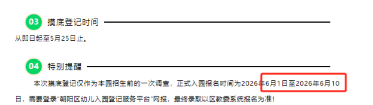 根据朝阳区部分幼儿园入园摸底信息显示,朝阳区2026年入园信息采集时间为6月1日-6月10日: