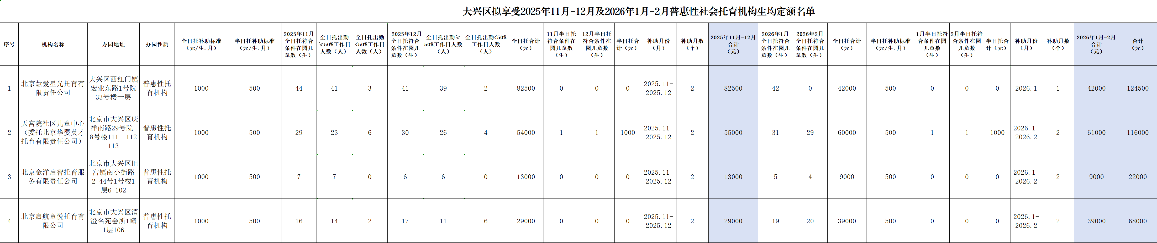大兴区拟享受2025年11月—12月及2026年1月—2月生均定额补助普惠性社会托育机构名单的公示