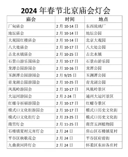 2024年北京春节庙会灯会开放时间表及地点一览表