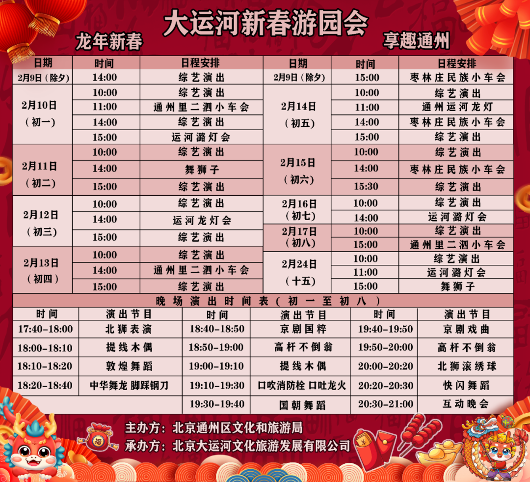 通州区大运河新春游园会将于2月2日至24日(农历小年至正月十五)在北京大运河文化旅游景区北区举办。