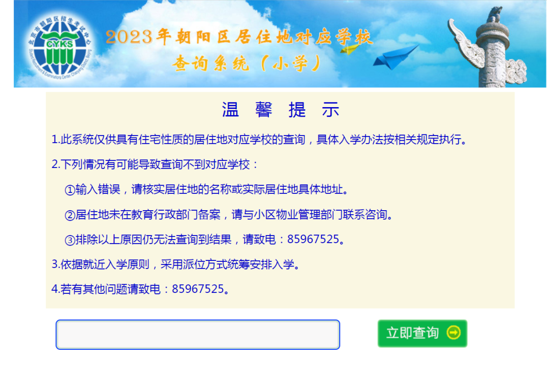 特别提醒:朝阳区划片查询系统可输入居住地进行查询(无需注册输入身份证号),结果仅供参考,具体请以2024年系统更新为准!