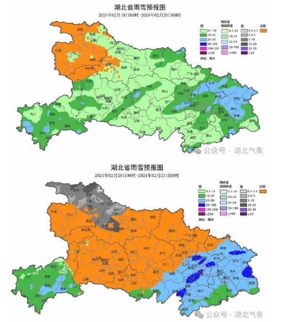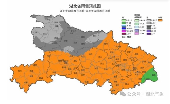 据湖北气象微信公众号,20日至25日,湖北全省自北向南将先后由雨转为冻雨、冰粒、纯雪,积雪深度北部地区6~12厘米,南部地区2~7厘米,山区15厘米以上;大部分地区有冻雨,冻雨量在10~30毫米,其中江汉平原南部和鄂东南等地冻雨量30~50毫米,大部分地区电线覆冰厚度2~10毫米,局地20毫米左右。