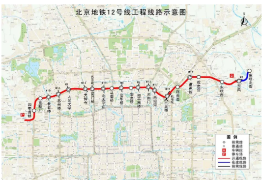 12号线(四季青桥-东风)是一条主要沿北三环东西向敷设的轨道交通干线,线路长约28.9公里,设车站20座,其中换乘站13座。