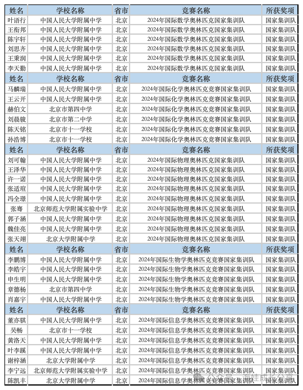 其中,中学生学科奥林匹克竞赛包含数学、物理、化学、生物、信息学五大学科。也就是这五大学科竞赛的国家集训队成员均可获得保送生资格,据中国科协最新名单公布显示,2024年北京共计33人进入五大学科奥林匹克国家集训队,其中人大附中22人、十一学校3人、北大附中3人、北师大附属实验2人、北京四中2人、北京二中1人。一起来看看!