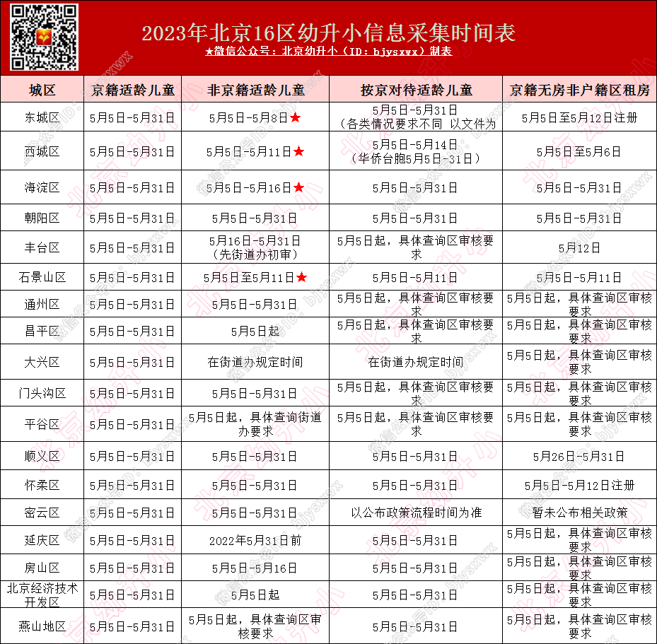 参考历年北京幼升小报名时间来看,整体比较稳定,一般在5月份,京京参考2023年各区各类人群报名时间,如下图所示: