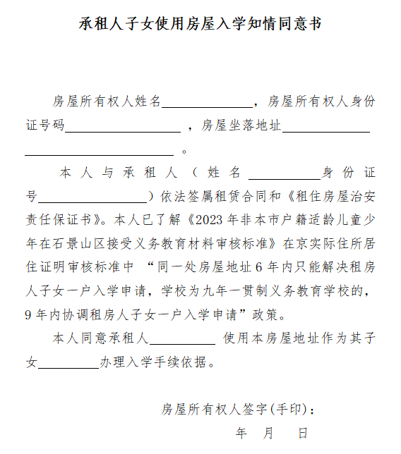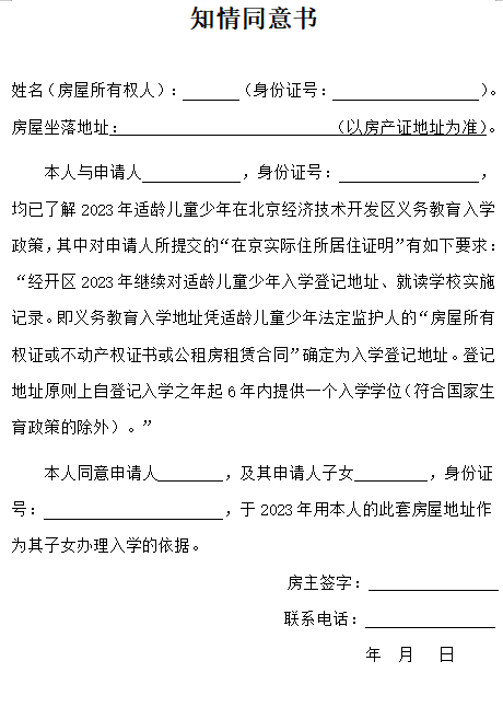 北京经济技术开发区幼升小房东知情同意书模板下载链接