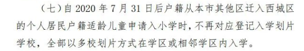 自2020年7月31日后户籍从本市其他区迁入西城区的个人居民户籍适龄儿童申请入学小学时,不再对应登记入学划片学校,全部以多校划片方式在学区或相邻学区内入学。