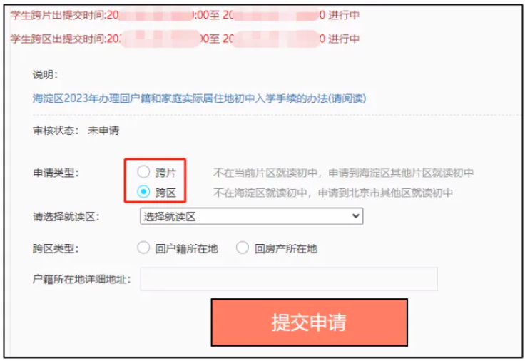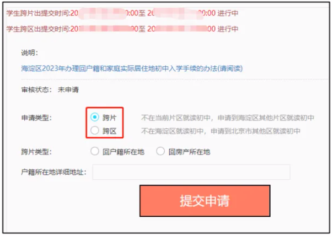 办理跨片前请家长阅读《2023年海淀区办理回户口所在地和 家庭实际居住地初中入学手续的通知》。(以下简称“办理通知”)