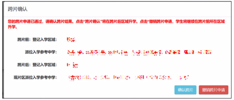 审核结果为“审核通过”的,家长须进行“确认跨片”。确认前,系统会提示跨片前后的区域和派位入学参考中学。