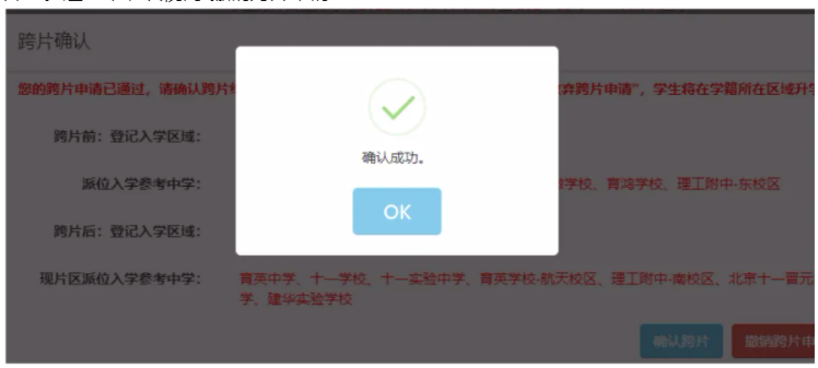 如家长认可跨片,点击“确认跨片”,系统提示确认成功,后期填报志愿时按照跨片后学校填写。跨片成功的家长,将不得更改跨片结果。如放弃跨片,点击“撤销跨片”学生在跨片前区域升学。逾期未确认视同“撤销跨片申请”