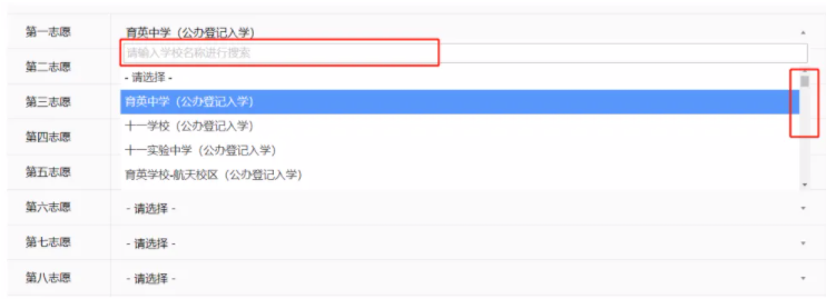 在下拉菜单中选择意向学校或者在文本框内输入校名查找意向学校。